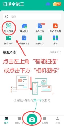打开软件后,可以在上方工具箱找到“智能扫描”,或者直接点击下方的相机图标,进入扫描界面。