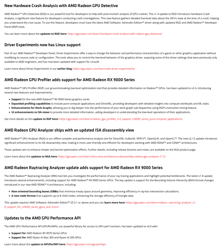 AMD更新了Radeon 开发者工具套件软件包,带来了多项新功能之外以及RX 9070系列显卡的支持。