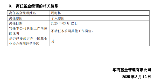 红星资本局3月12日消息,公募行业又一位明星基金经理或将离职。3月12日,华商基金公告称,周海栋因个人原因于当日卸任华商新趋势优选等6只基金的基金经理职务,不转任公司其他工作岗位,已按规定在中国基金业协会办理注销手续。