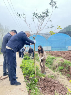 随后,全体人员前往董家埂镇深洞村乡道,在乡道旁种植桂花树,大家分工明确、配合默契,有的负责扶苗,有的负责填土浇水,在共同努力下,12棵桂花树在深洞村扎根,一株株新苗昂然挺立,焕发出勃勃生机,既为乡村增添绿意,又为桂香满村埋下“绿色种子”,以“党建红”引领“生态绿”。