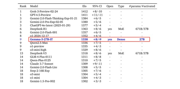 在性能测试方面,根据LMSYS ChatbotArena的盲测数据,Gemma-3的表现仅次于DeepSeek的R1-671B,优于OpenAI的o3-mini和Llama3-405B等知名模型。