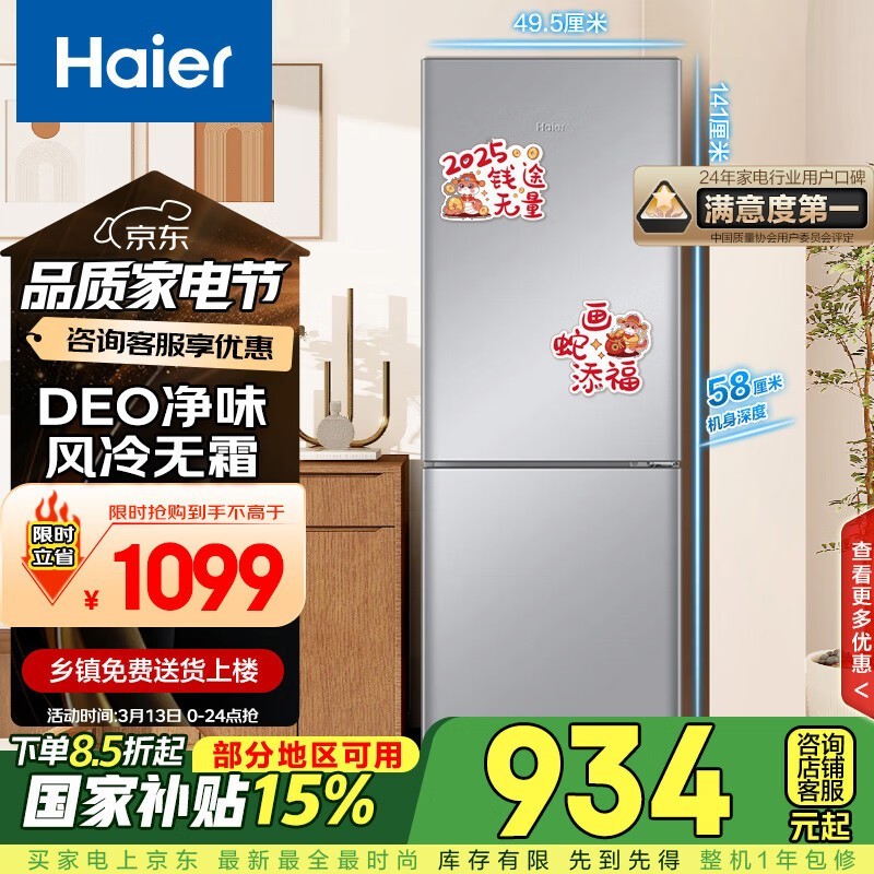 海尔172L风冷双门冰箱京东优惠价930元