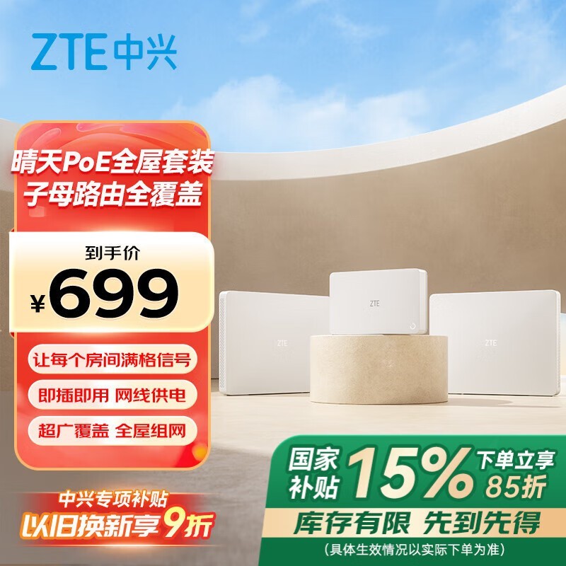 中兴星云系列晴天PoE全屋路由1母2子套装Wi-Fi6技术