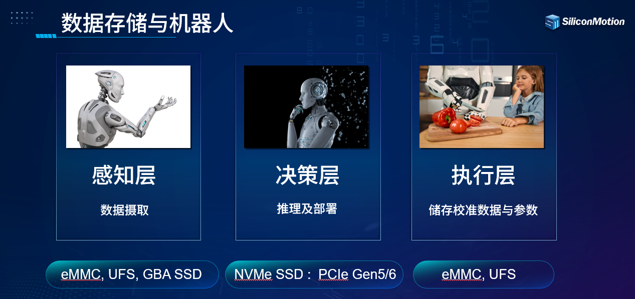 特别是针对现阶段大火的机器人行业,从机器人的感知层、决策层到执行层,慧荣科技的主控产品都可以实现存储方案对接,最终完成数据处理、推理、部署等任务。