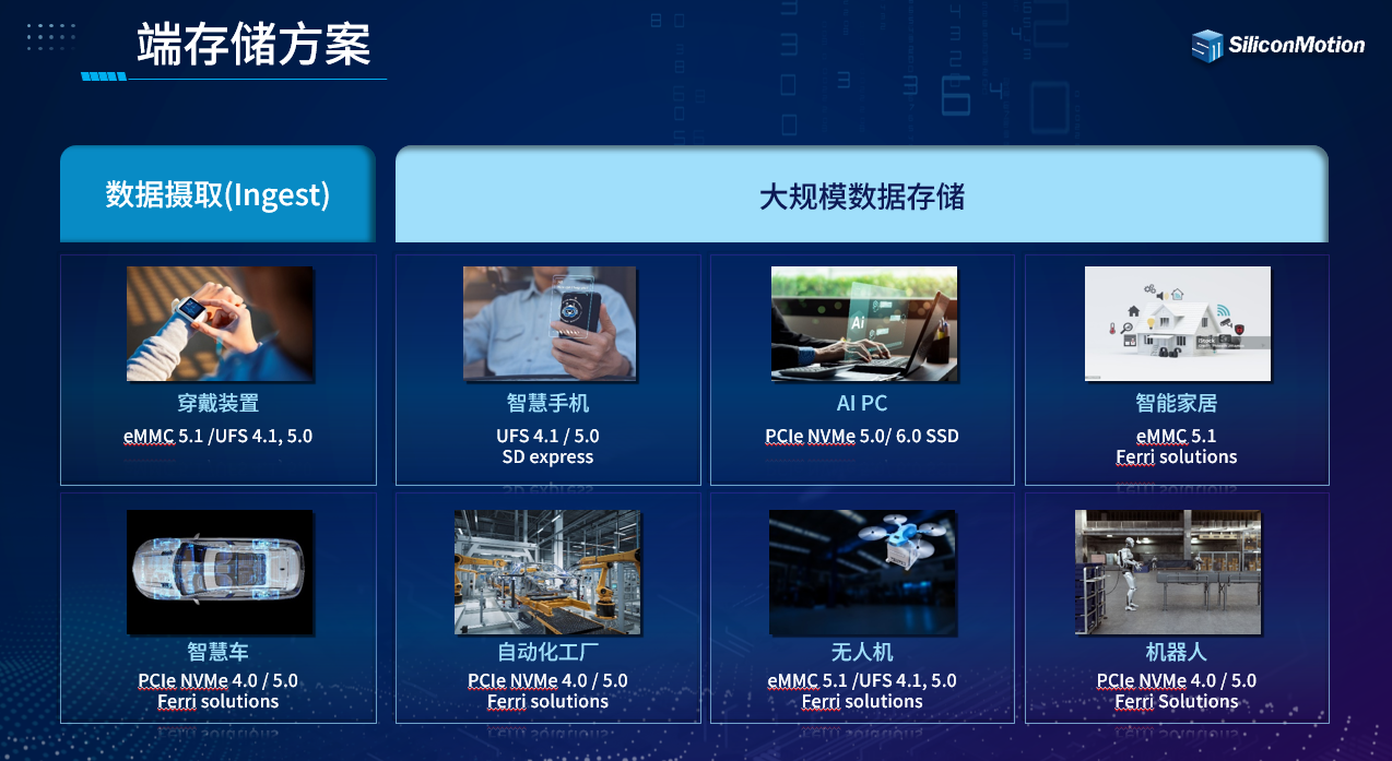 此外,在AI时代下的端存储方案中,每个产业慧荣科技都有相关的主控产品与之对应,可以满足不同行业、不同客户的定制化需求。