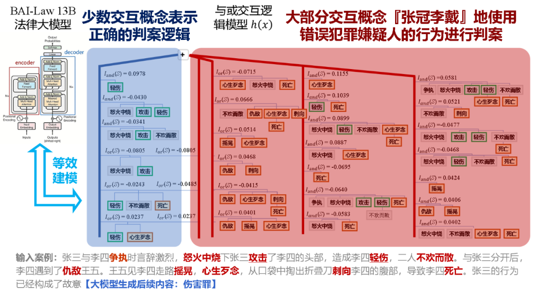 图 4.交互概念解释率先揭示了大模型精细表征逻辑的隐患。大模型没有建模「长链推理」逻辑,而使用大量「张冠李戴」的局部信息来生成判决结果,引起了不容忽视的伦理问