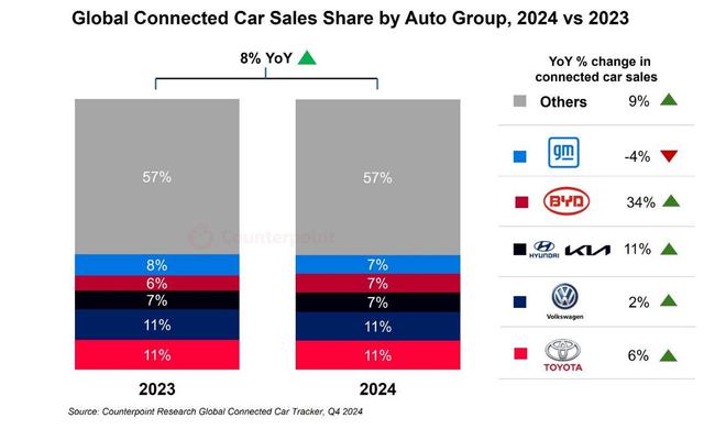 然而,专注于纯电动汽车的比亚迪凭借在所有车型中集成联网功能,并以具有竞争力的价格提供先进的安全和技术特性,实现了 34% 的同比增长,成为全球增长最快的车企。