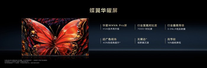 在当前显示技术领域,普通主流的 VA 屏的对比度通常为5000:1,而蝶翼华曜屏目前已实现高达 7000:1 的原生对比度,在控光能力、暗态效果及响应速度方面具有显著优势;同时,蝶翼华曜屏还增加了广色视角和广色域,并采用无黑边技术,赋予产品更沉浸的观看体验。而针对强光反射问题,TCL华星为蝶翼华曜屏搭载了0.5%最低反射率的纳米低反膜,能够有效减少外界光线反射,进一步提升观看体验,定义Mini LED领域高端显示的全新标准。
