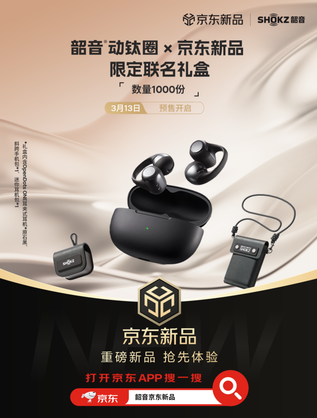 在“3月19日韶音京东重磅新品日”期间,OpenDots ONE将以韶音动钛圈*京东新品限定联名礼盒的形式首次亮相,礼盒包含OpenDots ONE新一代开放式耳机*原石黑、斜挎手机包、迷你耳机包,京东仅限1000组专属组合,并于3月13日10点开启预售,3月19日0点先人一步,抢先开售。