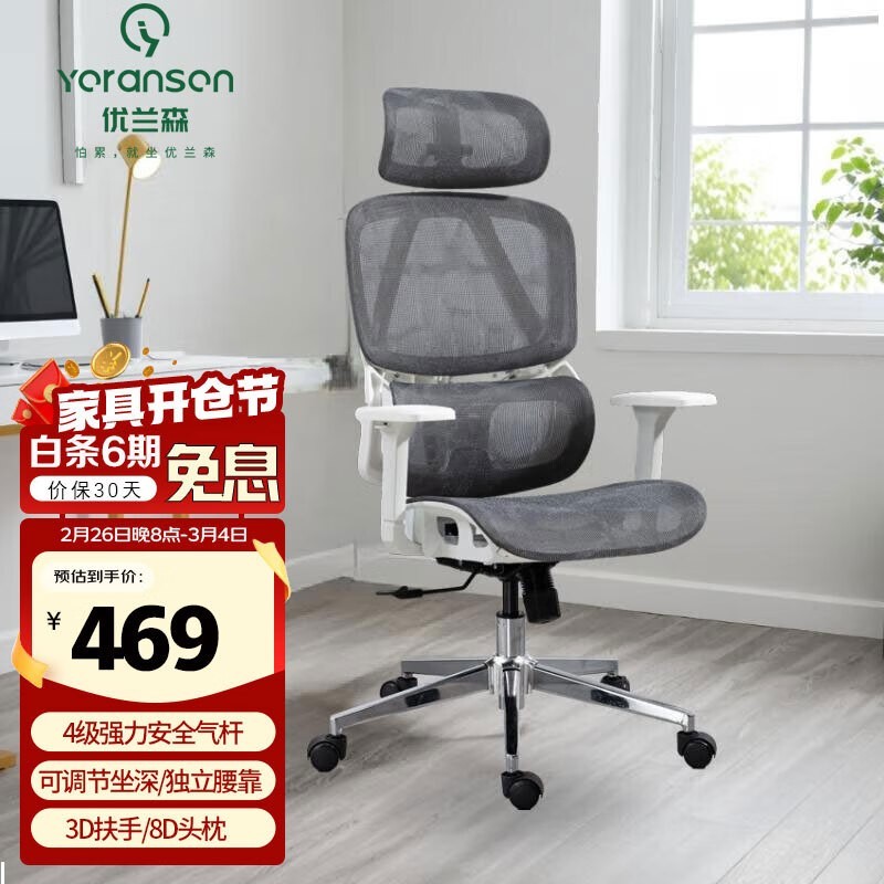 优兰森人体工学椅T205云白钢制脚优惠价579