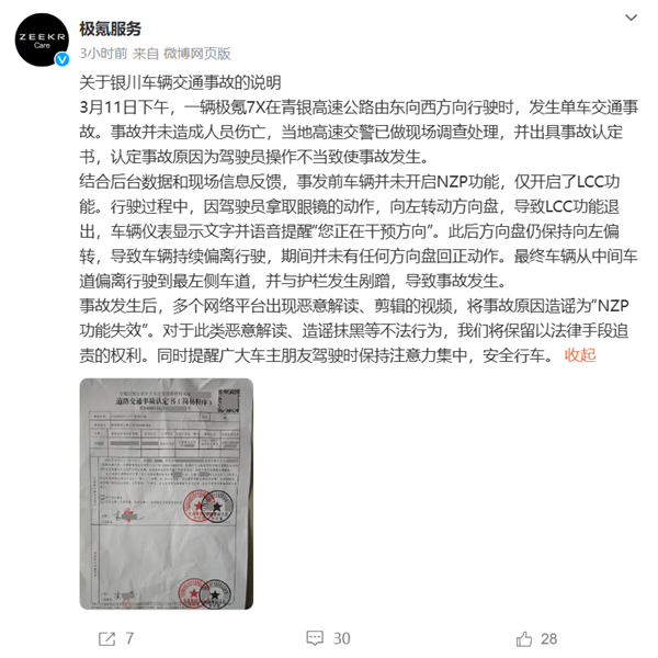 今日下午,“极氪服务”账号发布了“关于银川车辆交通事故的说明”。