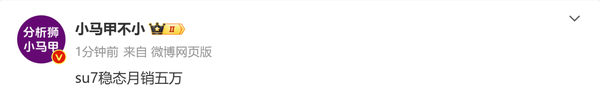 【CNMO科技消息】2月底,小米官方发布了小米SU7 Ultra,这是小米SU7系列的第四款车型,也是定位最高的一款车型。据车fans创始人孙少军透露,小米SU7 Ultra不但本身获得了大量订单,也带动了三款老车型的订单出现至少一定幅度的上涨。近日,有数据分析师表示,预计小米SU7将实现稳态月销量5万辆。