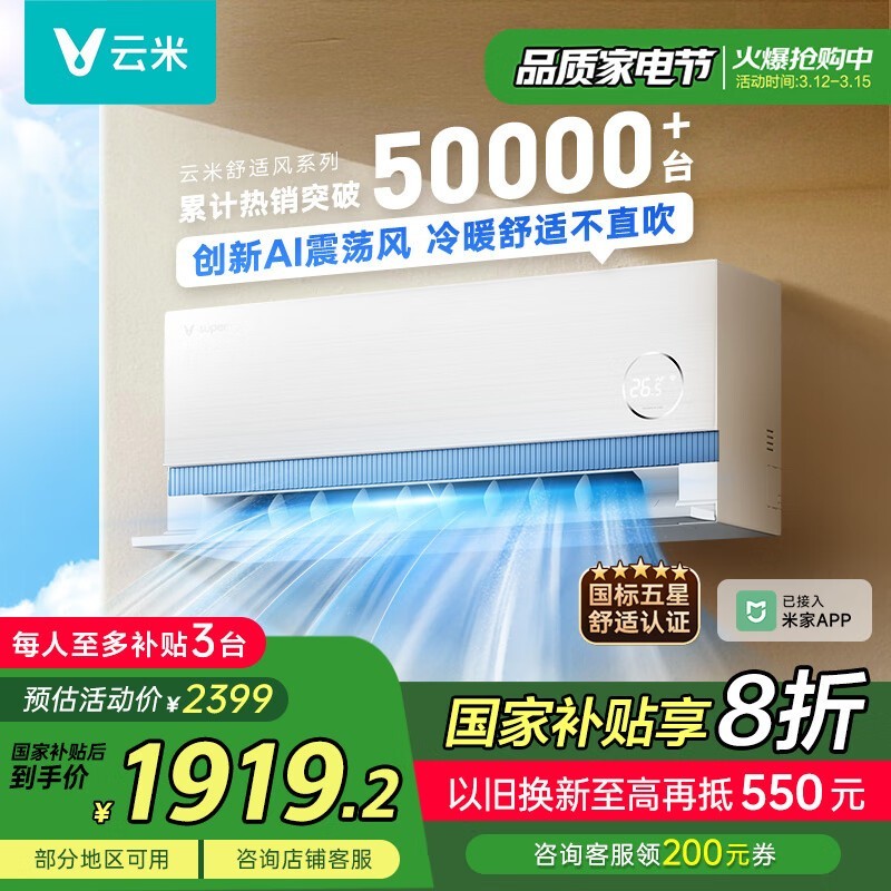 云米1匹壁挂空调仅1369元