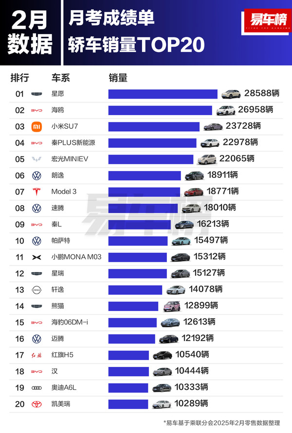 【CNMO科技消息】近日,CNMO注意到,有机构公布了2025年2月中国轿车市场的销量TOP 20车型,它们分别为: