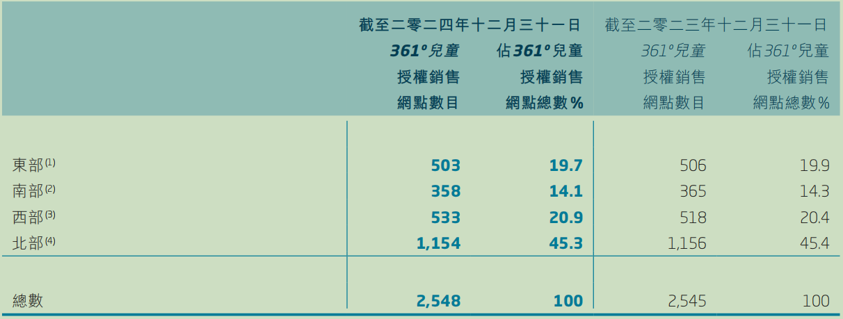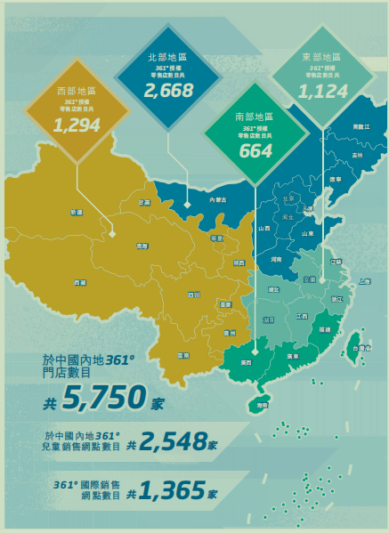 关于门店的布局和选择,361度称因主攻大众运动市场,集团策略性地采用分销业务模式,由一级分销商于各自专属地区,独家分销361º品牌旗下产品。经集团零售渠道管理部门批准,分销商可选择自行开设门店,亦可选择将361º品牌旗下产品分销予授权零售商。