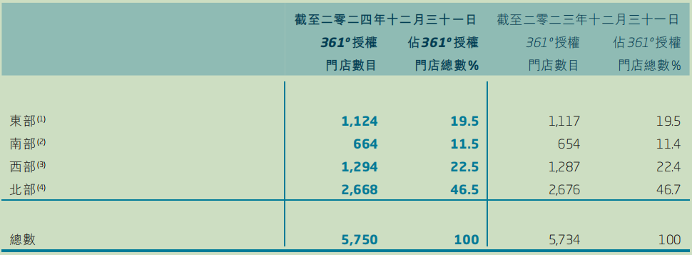 业绩报告披露,截至2024年12月31日,361度共有5750间361º品牌门店,单店平均面积达149平方米,同2023年12月31日相比,净增加11平方米。按区域划分,约75.9%的门店位于中国三线及三线以下城市,5.2%及18.9%的门店分别位于中国一线及二线城市。