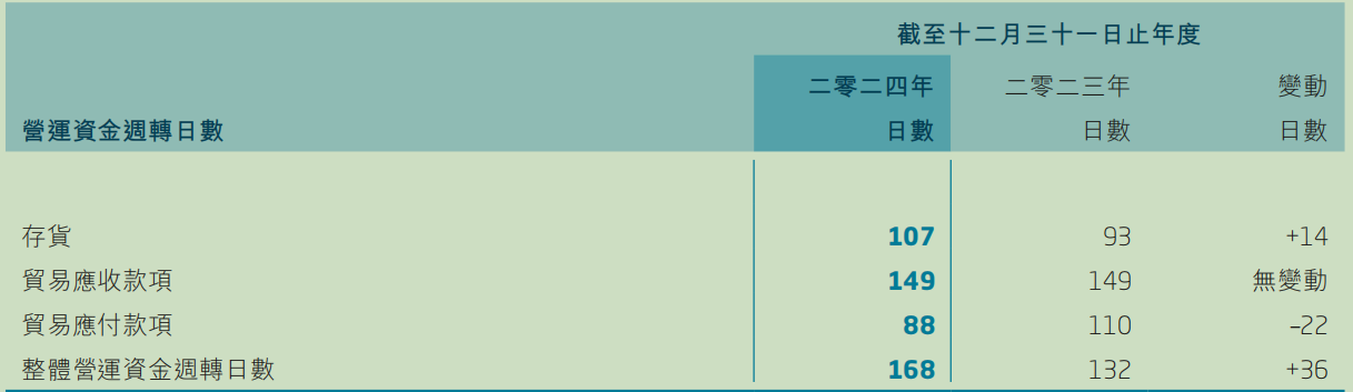 2024年361度的存货周转天数较上一年度增加了14天为107天,而贸易应付款项的周转日数减少22日,导致整体营运资金周转日数增加36日。