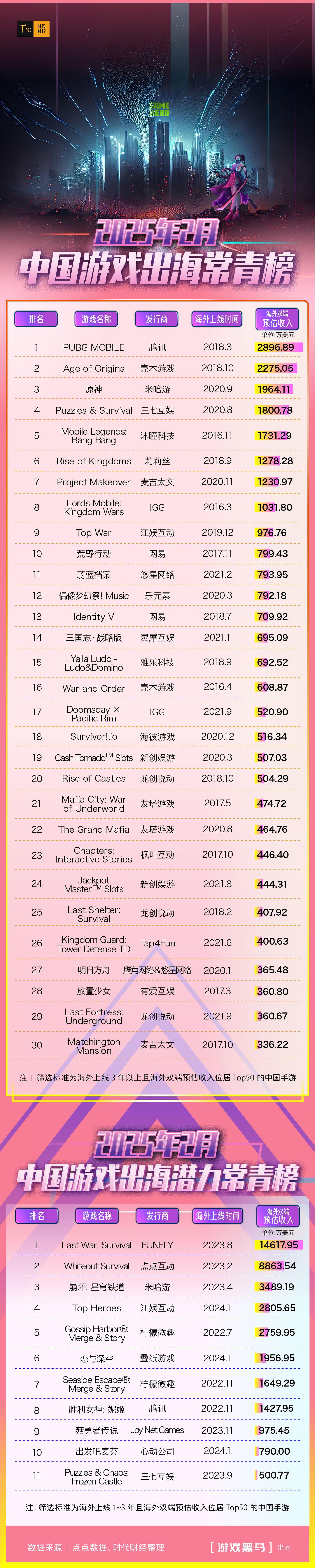 时代财经以海外上线3年以上且海外双端预估收入跻身Top50的中国手游为筛选标准,统计并发布《2025年2月中国游戏出海常青榜》(下称“《出海常青榜》”);同时以海外上线1年至3年且海外双端预估收入跻身Top50的中国手游为标准,统计并发布《2025年2月中国游戏出海潜力常青榜》(下称“《出海潜力常青榜》”)。
