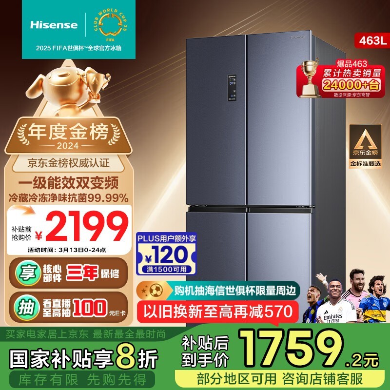 海信463L十字四开门冰箱BCD-463WMK1DPJ促销到手1528元