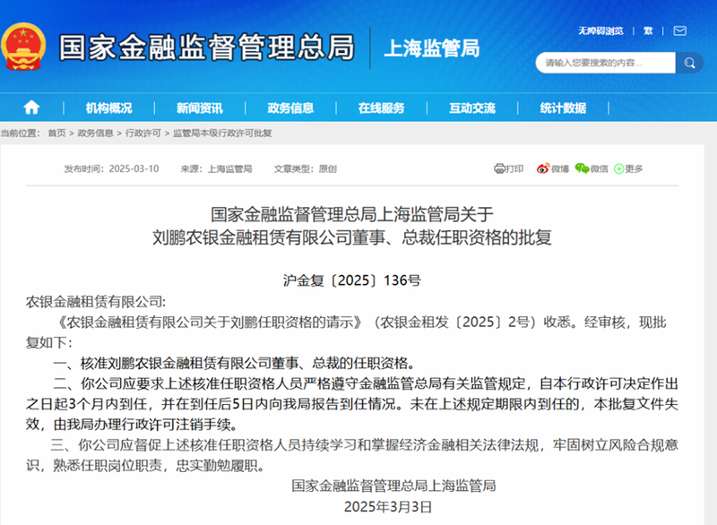 蓝鲸新闻3月13日讯(记者 黄玉洁)近日,国家金融监督管理总局上海金融监管局发布公告,核准刘鹏农银金融租赁有限公司董事、总裁的任职资格。