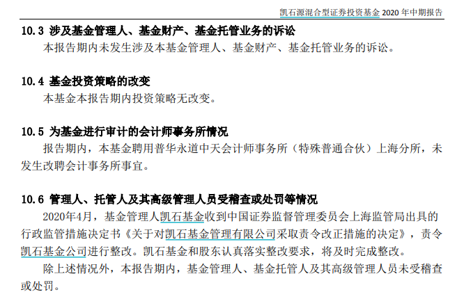 2020年4月,凯石基金又收到上海证监局出具的行政监管措施决定书《关于对凯石基金管理有限公司采取责令改正措施的决定》,责令凯石基金进行整改。凯石基金表示,公司和股东认真落实整改要求,将及时完成整改。
