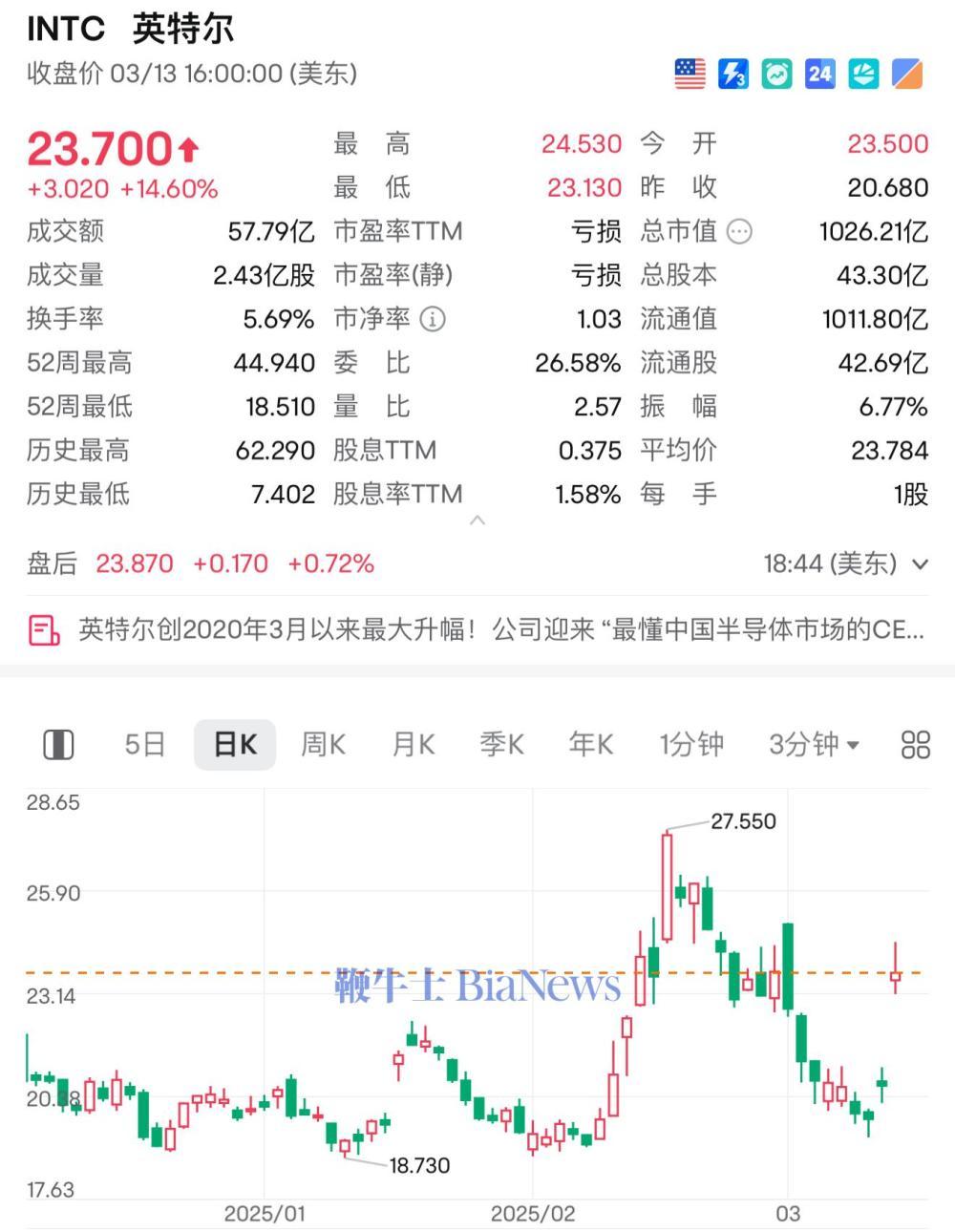 3月14日,截至美股收盘,英特尔大涨15%,创造自2020年3月以来最大单日涨幅。