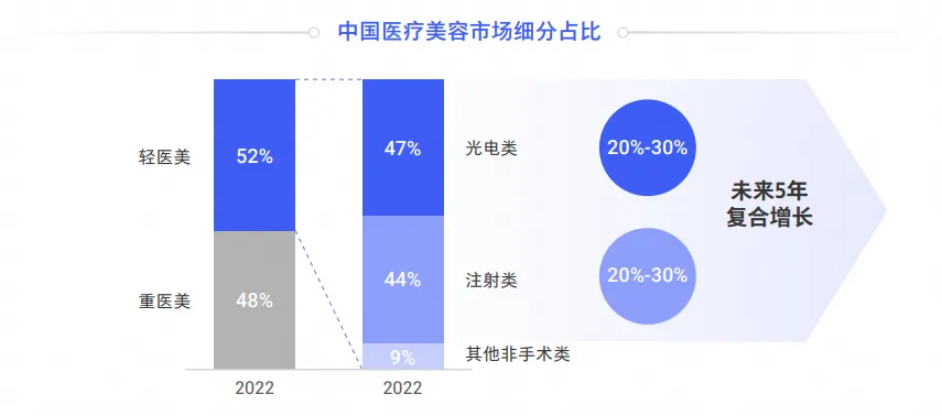 《腾讯2024年度轻医美消费趋势白皮书》显示,截至2022年,轻医美贡献整体医美市场超过一半的市场规模,达到52%,成为医美中主流的美容方式。其中光电类、注射类是主要的项目构成,且预计未来5年仍能呈现20%—30%的高复合增长率。