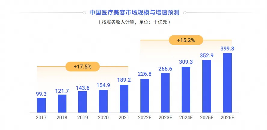 《2023医美人群洞察报告》显示,2022年医美消费用户规模超过2000万,较2017年增幅预计达488.5%。《腾讯2024年度轻医美消费趋势白皮书》显示,预计2023年中国医疗美容市场规模将达2,666亿元,2026年整个医美市场将达到近4000亿元的市场规模。