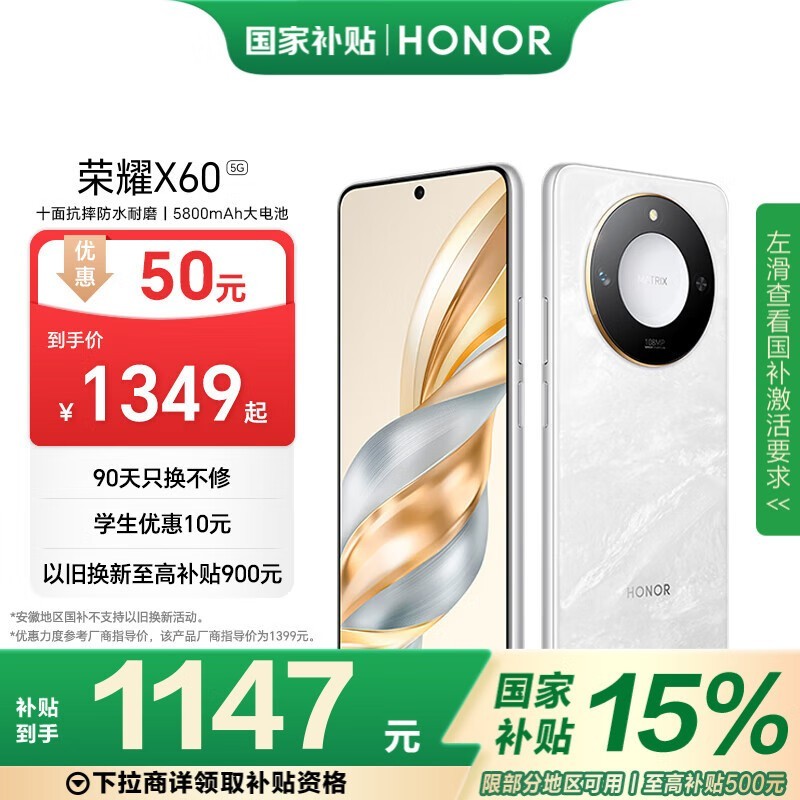 荣耀HONOR X60 5G手机京东特惠仅1146元