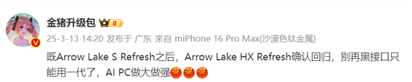快科技3月14日消息,根据博主“金猪升级包”最新爆料,Intel确认将推出Arrow Lake-S/HX Refresh处理器。