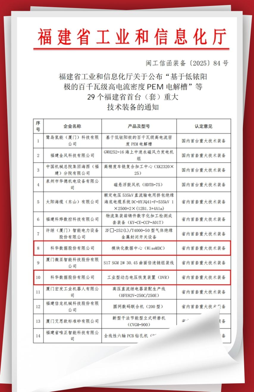近日,福建省工业和信息化厅公布2024年福建省首台(套)重大技术装备认定名单,科华数据股份有限公司自主研发的“模块化数据中心(WiseMDC)”与“工业型动态电压恢复装置(DVR)”双双入选。