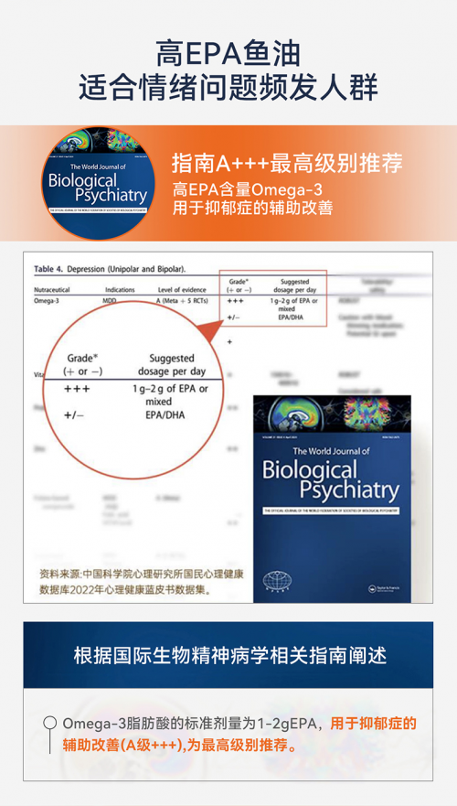《2022世界生物精神病学会联合会/加拿大情绪和焦虑治疗网络临床指南》推荐高EPA含量Omega-3用于抑郁症的辅助治疗(A级)。因此,可以选择一款经过医学临床循证研究,并支持情绪健康的鱼油来针对性的改善、预防抑郁。如cns情绪鱼油。它采用超临界七级真空分子萃取,Omega-3纯度高达97%,EPA含量高达90%,且EPA与DHA的比例大于2:1的有效比例,并且富含多种维生素和矿物质,符合临床指南推荐的用于辅助治疗抑郁症的标准。连续4周服用,能改善抑郁症状。