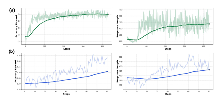 无论在 Instruct 还是 Pretrained Model 上,我们均在极简 RL 设计以及数据筛选策略下实现了稳定的 Accuracy Reward 提升和 Response Length 提升。