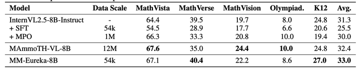 极大的数据效率:仅使用 54K 图文数据进行规则型 RL 训练,平均性能超过使用 1M 数据的 MPO 模型;整体基准准确率与使用 12M 数据进行 CoT SFT 训练的模型相当!MM-Eureka-Zero 仅使用 8K 图文数学推理数据(指令模型的 0.05%),在我们自建的 K12 基准测试上超越指令模型 8.2%,在 MathVerse 上表现相当。