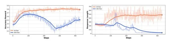 数据选择对于稳定 RL 训练很重要!基于难度的数据过滤策略对 RL 训练稳定性至关重要。在 8B-instruct 模型上进行 RL 训练时,若不进行数据过滤,训练过程极其不稳定。