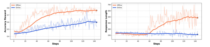 Online Data Filter:我们将预先基于难度的数据筛选策略记为 Offline Data Filter。这种方案虽然可以帮助 RL 进行稳定训练,但其数据利用率降低了,因此我们希望在模型训练过程中动态进行基于难度的数据筛选(类似 PRIME)。然而,我们发现训练结果不如 offline data filter 稳定,我们认为这是因为每次更新时的数据量不同,导致梯度不稳定。