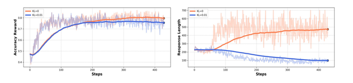 极简的 RL 设计足以获得出色效果。在 instruct 模型上实验时,添加 KL 散度会限制模型探索,导致无法观测到 response length 的提高。