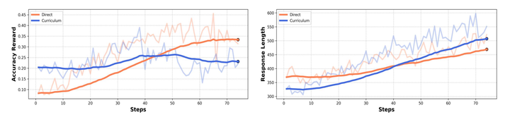 Curriculum Learning:尽管我们基于难度划分数据并尝试从易到难训练,但未观察到明显性能提升。我们认为简单问题的学习难以直接泛化到难题,如何更有效地组织课程学习数据仍需探索。