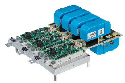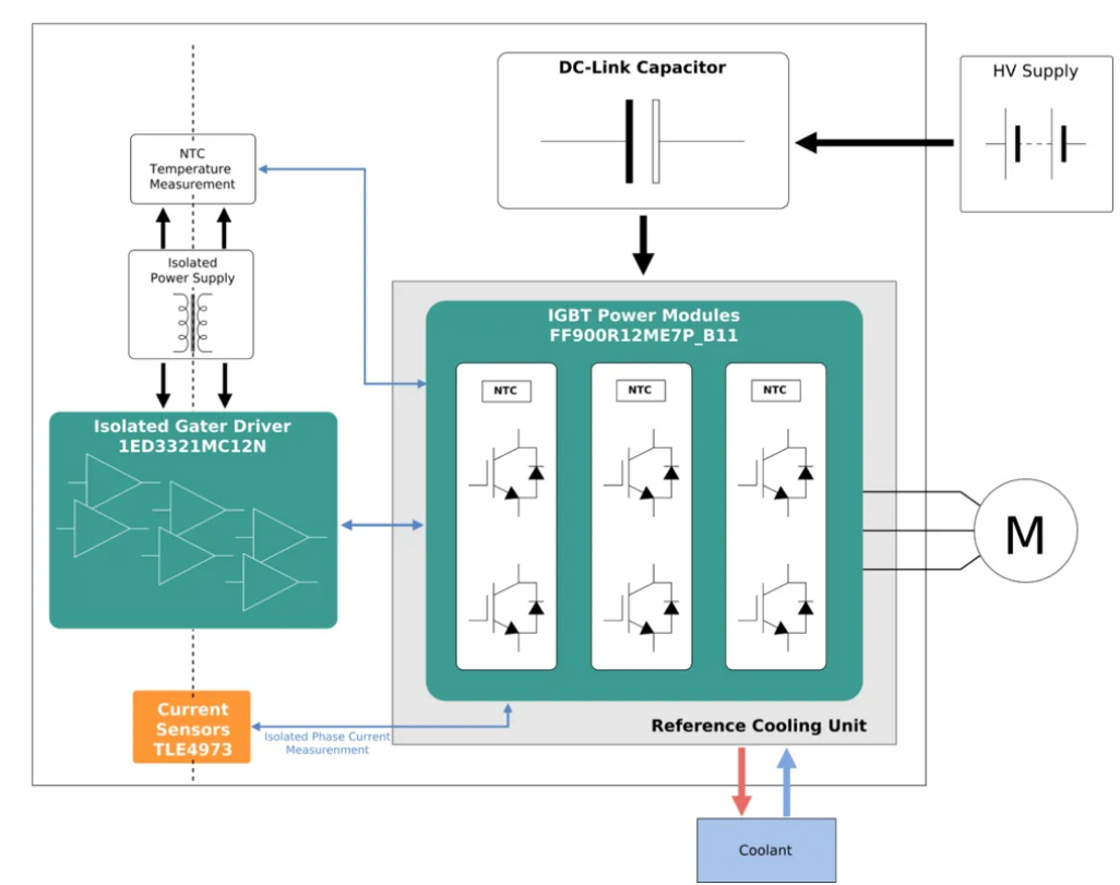 REF-CAV250KMT7INV是一款用于800V eCAV牵引系统的250kW三相逆变器主驱功率单元,它包括三个900A 1200V EconoDual™ 3 IGBT7功率模块、安装在功率模块上的三个独立栅极驱动器板(采用1ED3321MC12N EiceDRIVER™栅极驱动器和电流扩展电路)、安装在逆变器输出母线上的TLE4973霍尔电流传感器、专为模块设计的水冷板以及直流母线电容。