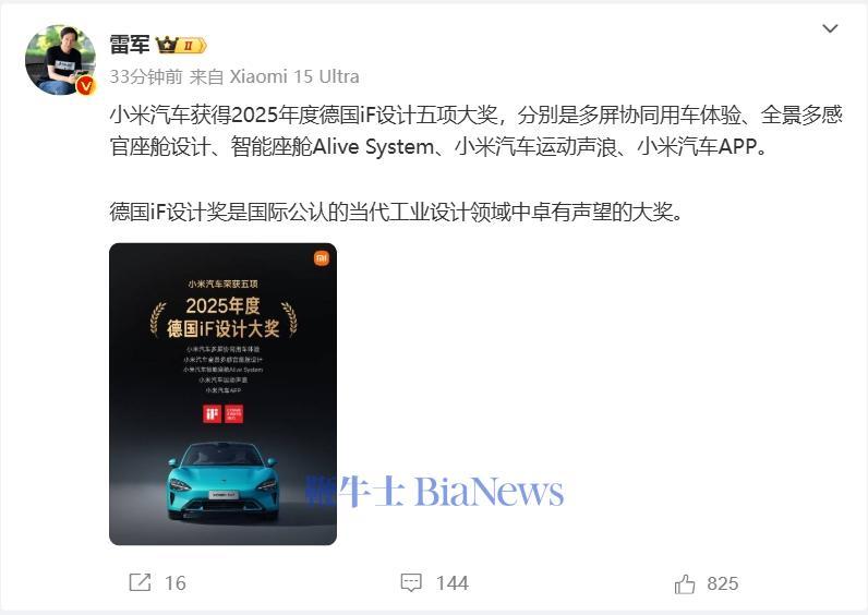 雷军:小米汽车获得2025年度德国iF设计五项大奖