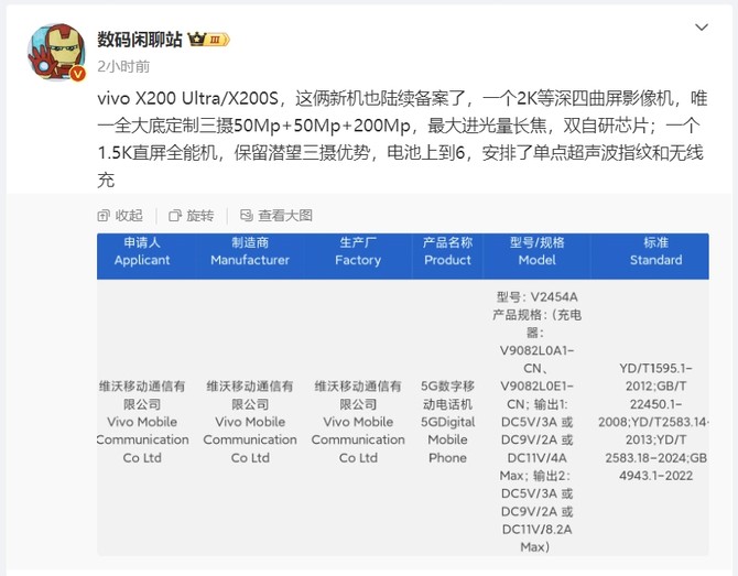 vivo 拟定于 4 月底推出一系列全新产品,产品阵容涵盖 X200 Ultra、X200S、Watch 5,以及一款配备 12.95 英寸屏幕的高性能平板。早在 3 月 14 日,vivo X200 Ultra 和 X200S 便已顺利通过 3C 认证,并完成入网备案。
