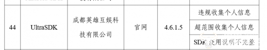 内容显示,工信部组织第三方检测机构进行抽查,共发现50款APP及SDK存在侵害用户权益行为,其中由成都英雄互娱科技有限公司开发的“UltraSDK”(4.6.1.5)存在违规收集个人信息、超范围收集个人信息以及SDK使用说明不完整三项问题,该SDK应用来源于它的官网。
