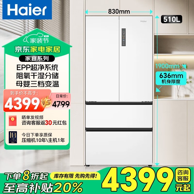 海尔510L法式多门冰箱嵌入式变频静音京东优惠价2863元