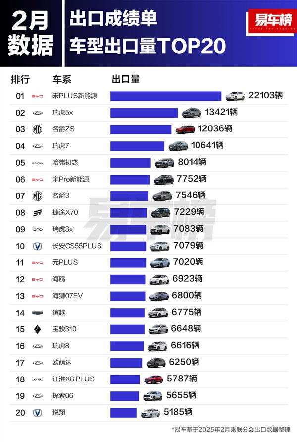 快科技3月14日消息,易车榜今日发布了2025年2月汽车品牌及车型出口量TOP20榜单。
