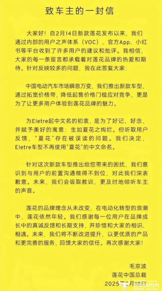 2月18日,时任莲花中国总裁的毛京波公开发布《致车主的一封信》,对旗下两款新车大幅降价及命名争议公开致歉。她表示,中国电动汽车市场瞬息万变,推出新款车型并拓宽价格带,降低起售价格门槛应对竞争,更是为了让更多用户体验到莲花品牌的魅力。