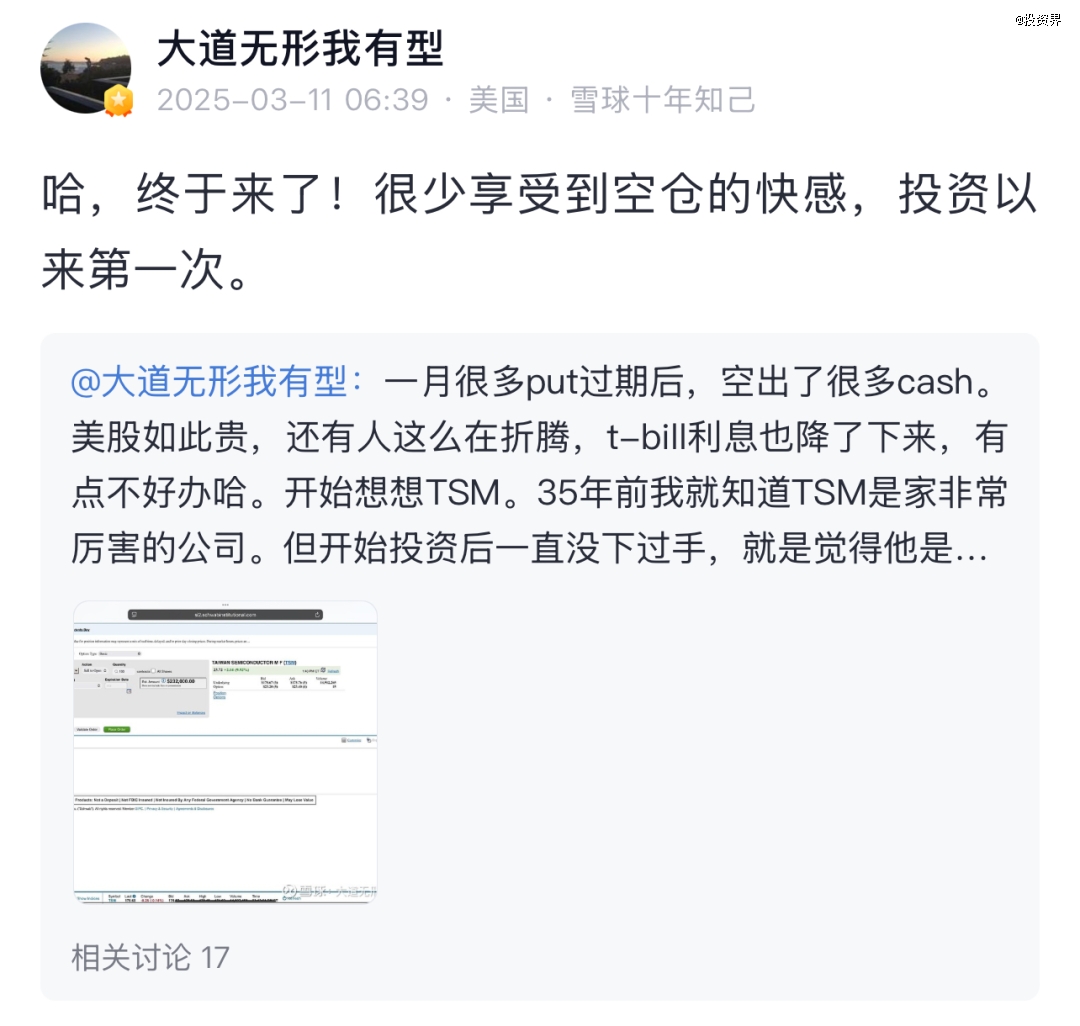 3月11日,他的社交账号“大道无形我有型”发言:“哈,终于来了!很少享受到空仓的快感,投资以来第一次。”