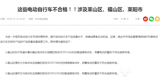 根据官网公告披露,这三款分别是福山区东厅街道办事处腾达电动车行销售的型号为TDT1418Z、福山区清洋立马电动车店销售的型号为TDT1393Z、莱阳市姜疃瑞胜电动车经销店销售的型号TDT1418Z。不合格项目都为蓄电池防篡改不符合国家标准。