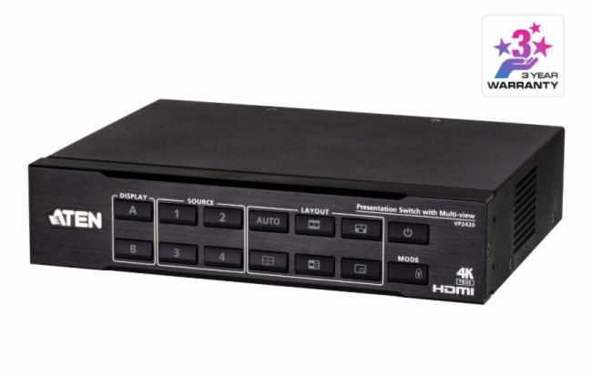 同时,VP2420还采用全金属外壳设计,不仅提升了系统的耐用性,更确保了良好的散热性能。其支持待机模式,可节省电力并加快唤醒时间。同时,VP2420还支持多种控制方式,包括前面板按钮、RS-232、IR、Telnet、Web GUI和ATEN Video Presentation Control移动设备应用程序等,让用户能够轻松管理多媒体信号,并将其融合至协作活动中。