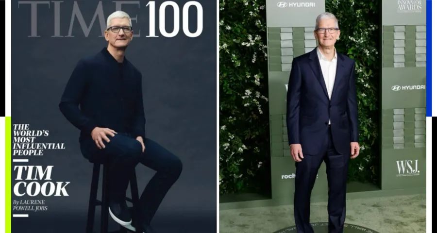 在更早的2022年,库克登上《时代》周刊封面时,穿得也依旧是深蓝色立领夹克和这双Triple Stitch。与过去库克偏爱的条纹Polo相比,这一身显然更能衬托出他思维敏捷、果断高效的领袖气质。