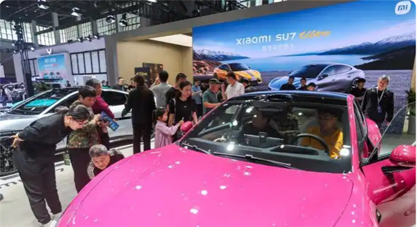 据照片显示,小米展台前一辆浅紫色汽车吸引大量车主围观。